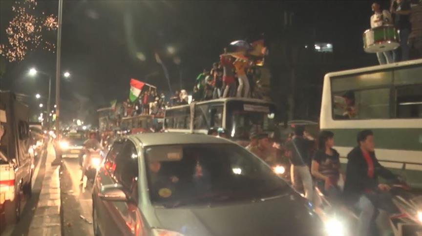 Polisin geniş güvenlik önlemi aldığı başkent Cakarta'da, caddelerde binlerce Müslüman uzun konvoylar oluşurken, kentin dört bir yanında havai fişekler gökyüzünü süsledi.