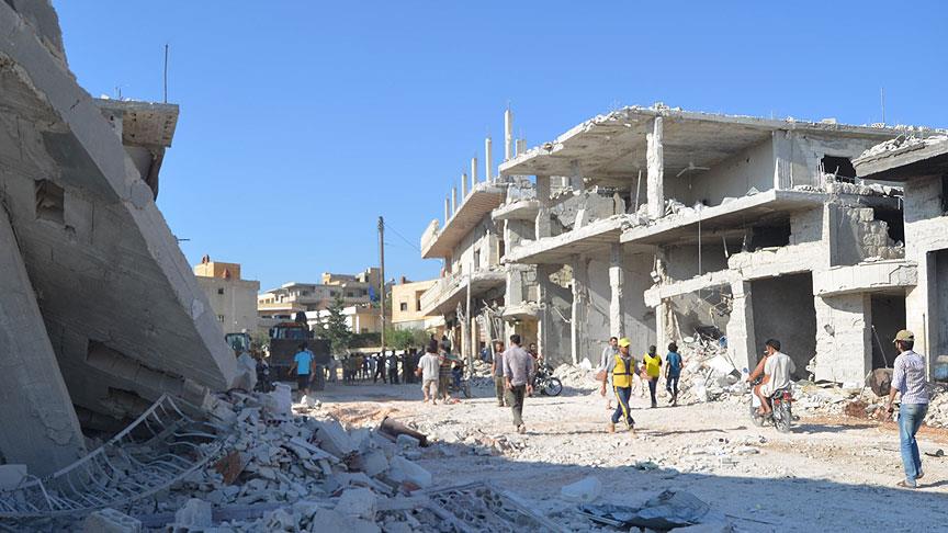 Önünde hatıra fotoğrafı çektirilen panoda, bombardımanlarda harabeye dönmüş Halep'teki yıkım ile enkazların arasında yakınlarını ve eşyalarını arayan insanlar görülüyor.