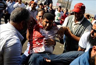 Gazze'de Uluslararası Kızılhaç Örgütü merkez binasının önünde biraraya gelen çok sayıda Filistinli, Mısır'da barışçıl gösteriler düzenleyen darbe karşıtlarına yönelik müdahalelere tepki gösterdi.
