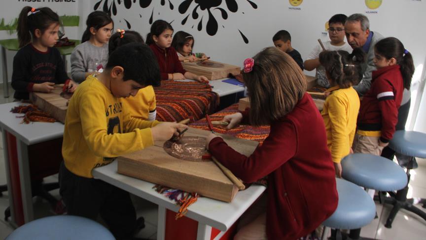 İlkokuldan liseye kadar her yaştan yaklaşık 100 öğrenci, haftada iki saat ustalardan bakır işlemeciliği eğitimi alıyor.