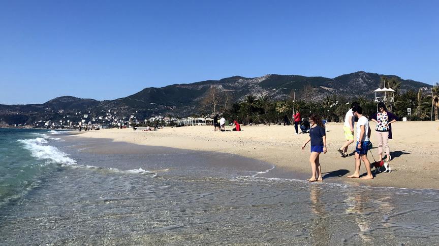 Alanya ilçesinde güneşli havayı fırsat bilen yerli ve yabancı tatilciler denize girdi, sahilde güneşlendi.