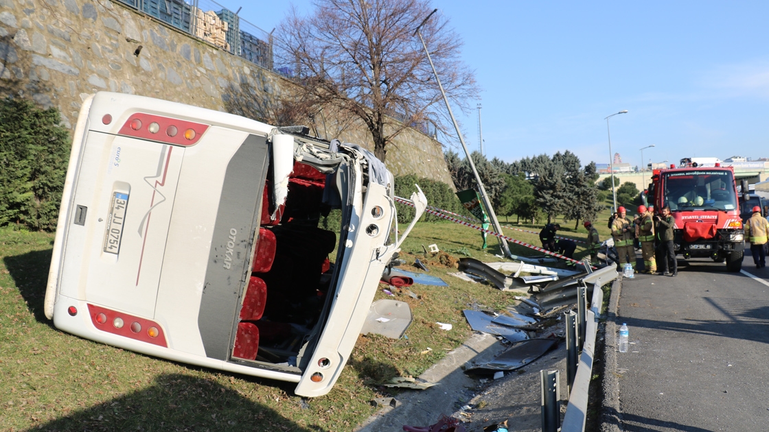 Çarpmanın etkisiyle savrulan minibüs, bariyerleri aşarak yolun kenarındaki boş alana devrildi.