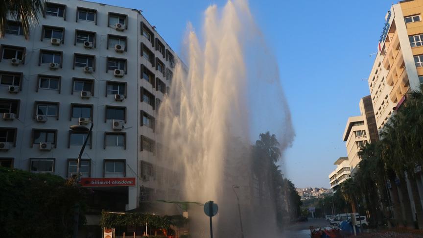 İzmir'in Konak ilçesinde patlayan borudan fışkıran su, 8 katlı apartman yüksekliğine ulaştı.
