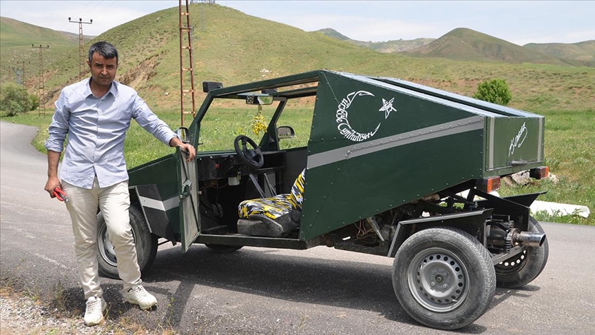 Hakkari'nin Yüksekova ilçesinde geçen yıl evinin bahçesine kızının görmeyi çok istediği Anıtkabir ve Aslanlı Yol'un kardan maketini yapan inşaat ustası Mehmet Şerif Karahan, şimdi de hurda malzemelerden yararlanarak benzinle çalışan araç yaptı.