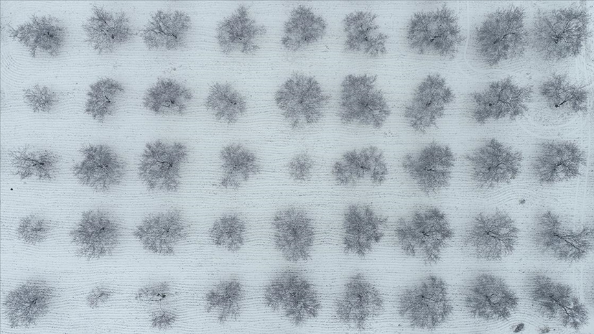 Beyaz örtüyle kaplanan kayısı ağaçları, dron ile görüntülendi.