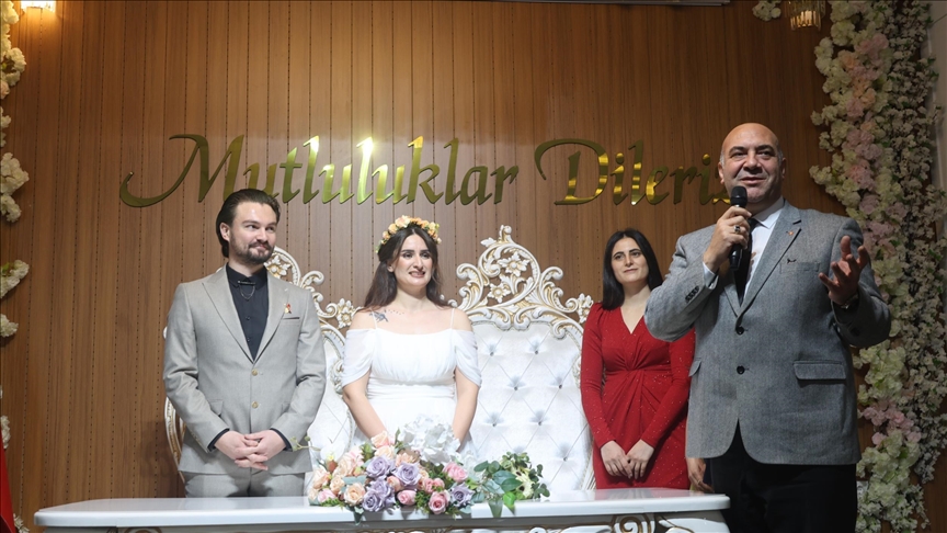 Aras'ın nikah şahitliğini yaptığı öğretmen çiftin törenini, aileleri cep telefonlarından görüntülü aramayla takip ederek mutluluklarına ortak oldu.